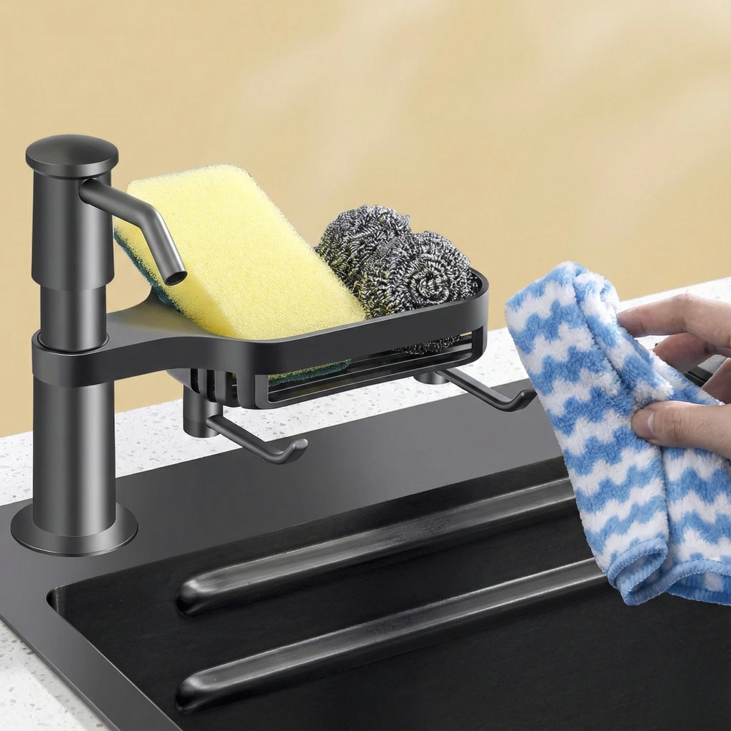 Tích hợp khay ráo nước: Thiết kế 2-trong-1 có rãnh thoát nước giúp miếng rửa bát luôn khô ráo, ngăn ngừa vi khuẩn tích tụ.